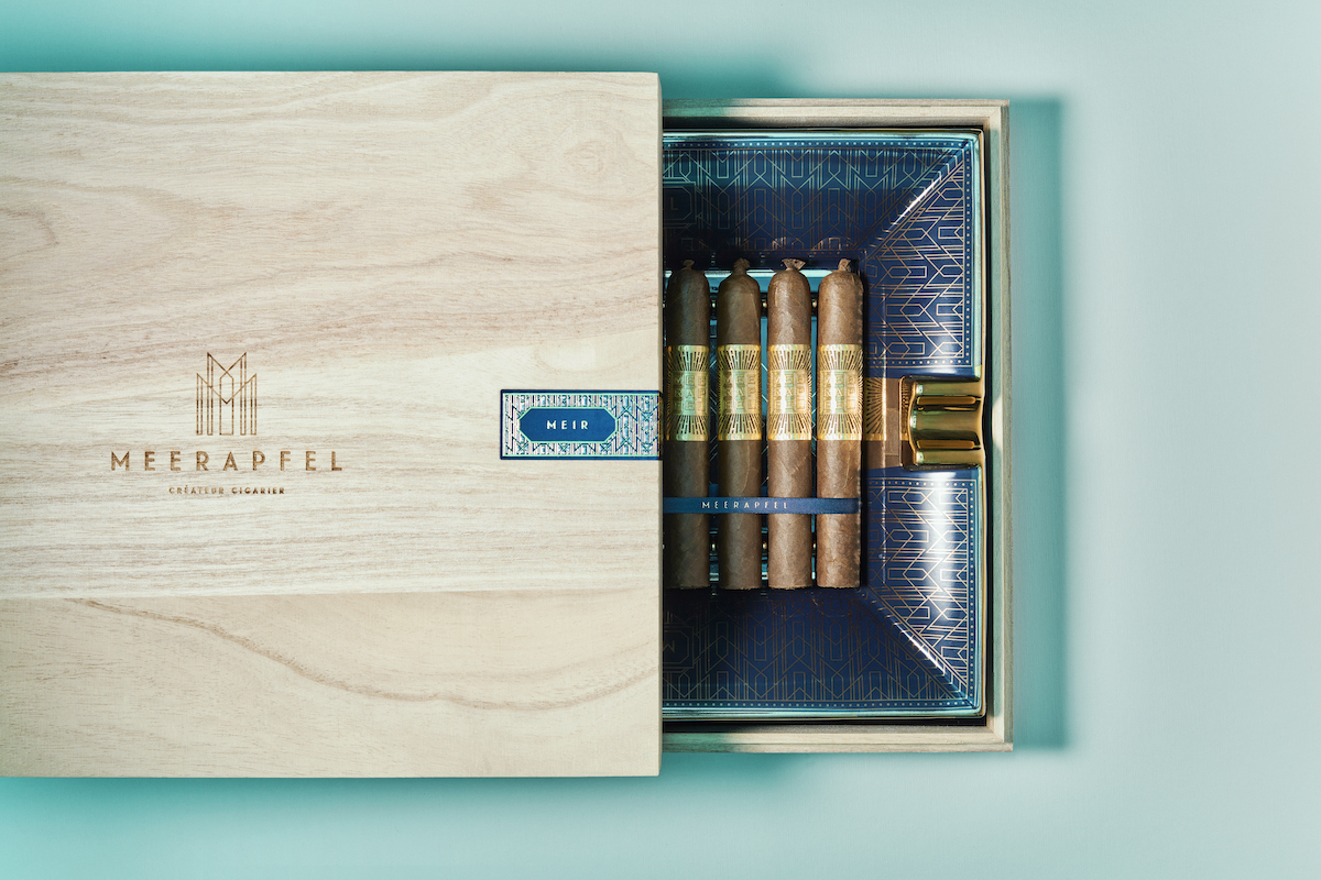 MEIR est le second Master Blend de chez MEERAPFEL Cigar et prend la forme de quatre nouveaux modules: Double Robusto, Churchill, Pyramid et Robusto. Meir Meerapfel créa en 1876 la première fabrique de cigares de la famille, dans le village d'Untergrombach en Allemagne. Si la composition des Master Blend n’est jamais dévoilée, on sait cependant que la cape de ces vitoles provient de feuilles de tabac du Cameroun vieillies 20 ans! Le Double Robusto est présenté dans un magnifique coffret comprenant un cendrier bleu marine, dont huit exemplaires sont disponibles auprès de votre Tabashop.