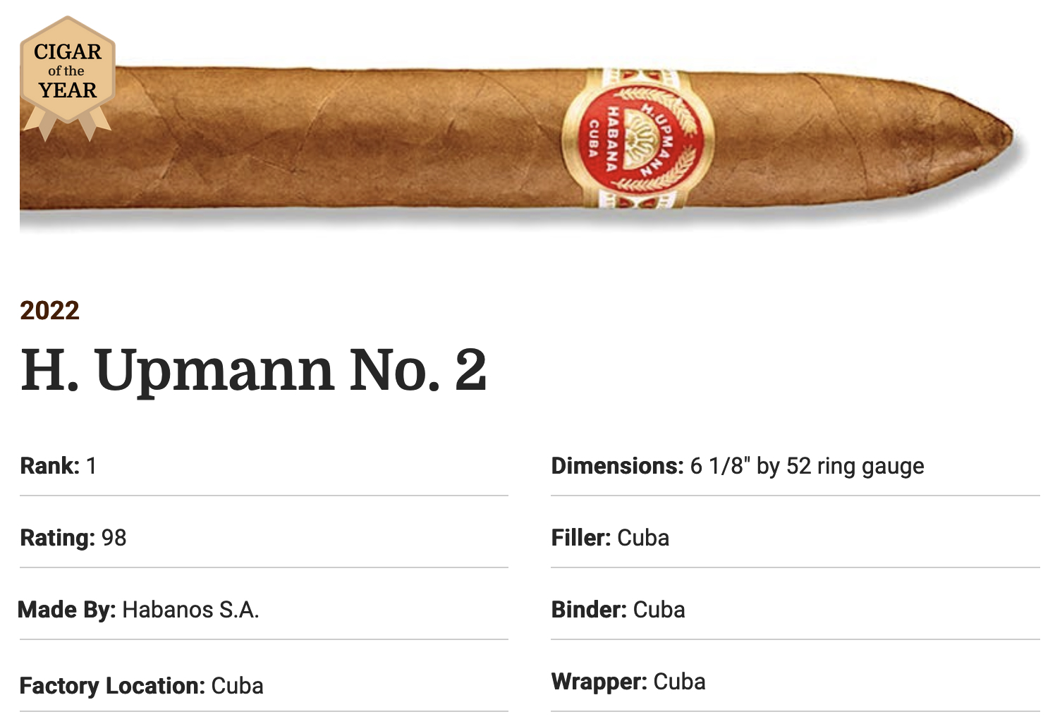 En 2022, Cigar Aficionado désignait le H. Upmann No.2 cigare de l'année, avec la note exceptionnelle de 98/100.