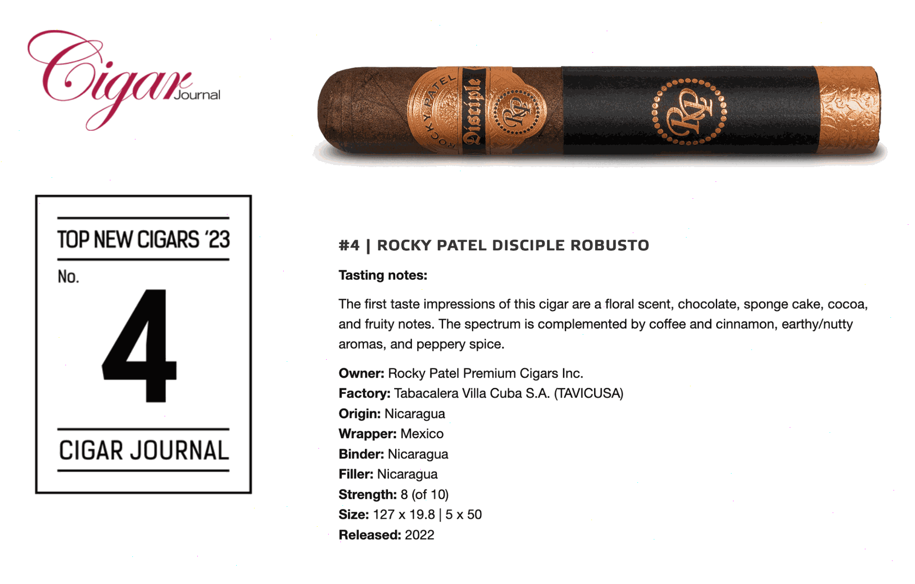 Cigar Journal a désigné le Rocky Patel Disciple Robusto 4ᵉ meilleur cigare de l'année 2023.