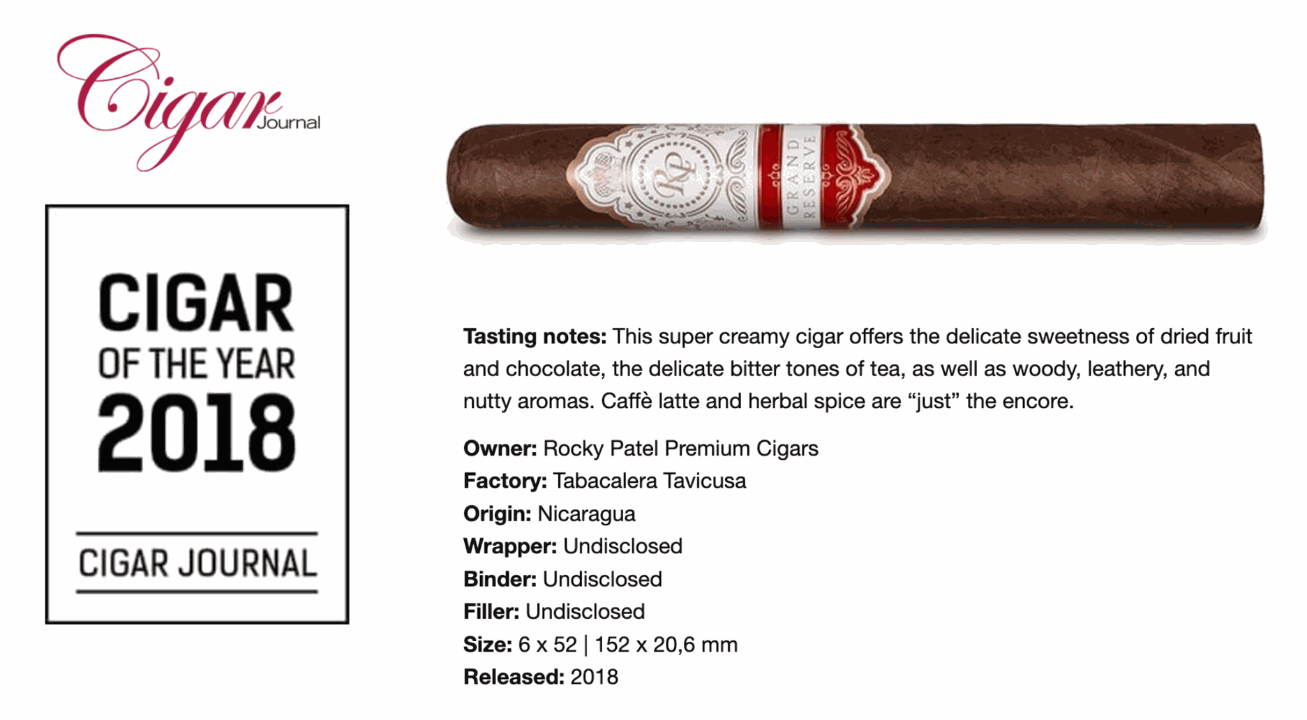 Le cigare Rocky Patel Grand Reserve Toro fut élu cigare de l'année 2018 par Cigar Journal, avec une note de 93 points sur 100.
